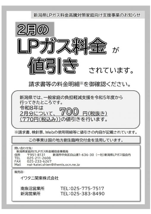 新潟県LPガス料金高騰対策支援事業のお知らせ 2026/1/14